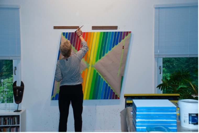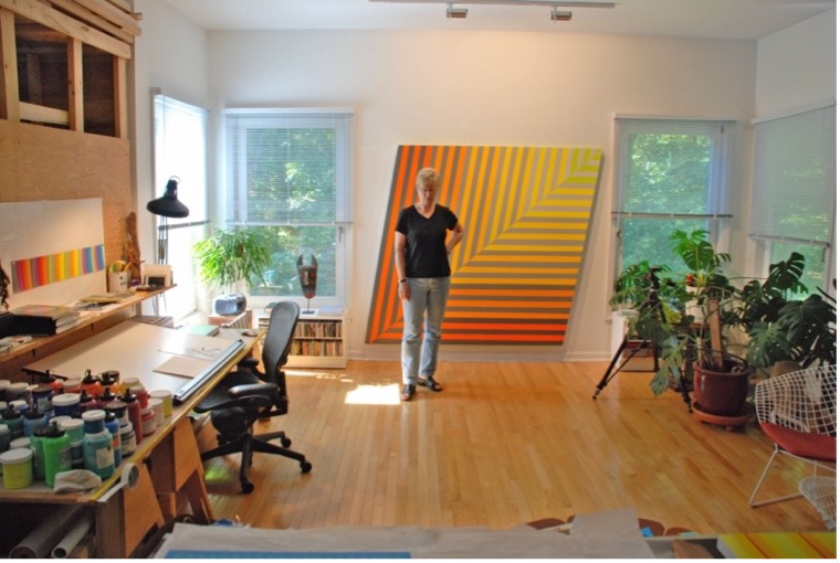 Early on, I was in my studio wondering, “What should I paint? What should my direction be?” There was a blue 8 1/2 x 11 inch sheet of paper pinned to the studio wall. It looked so beautiful to me– it was ultramarine blue, silkscreened. I looked at it for a long time. When I changed my viewpoint to another spot on the wall, I saw the afterimage, that orange pulsating– light communicating back to me that I was alive. I had a sensation, a very important moment that made me realize, “That's what I want to paint. I want to concentrate on color.” The time was not favorable for color painting; it was the late 1980s.